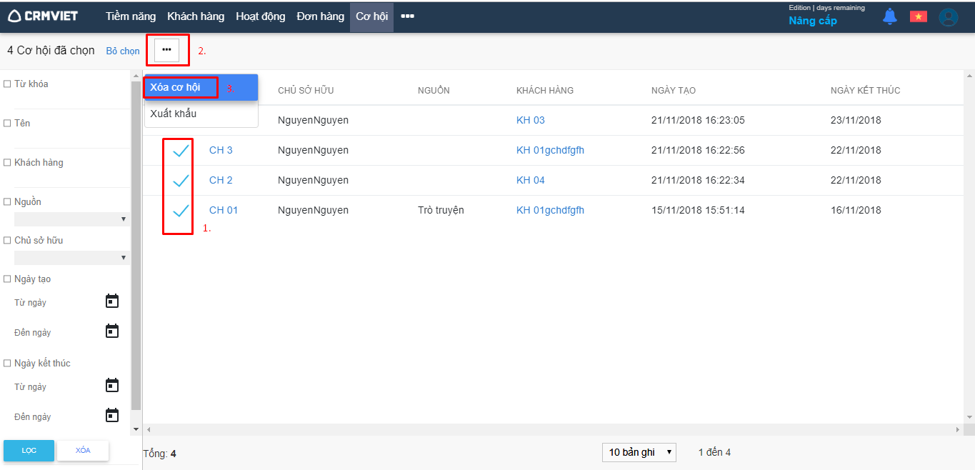 Thao tác để xóa cơ hội: Danh sách cơ hội -> Tích chọn cơ hội cần xóa -> Click nút More -> Click chọn Xóa cơ hội để xóa -> Xuất hiện pop up xác nhận xóa -> click chọn Xóa để xóa & click chọn Hủy để không xóa. (Hình 1,2)