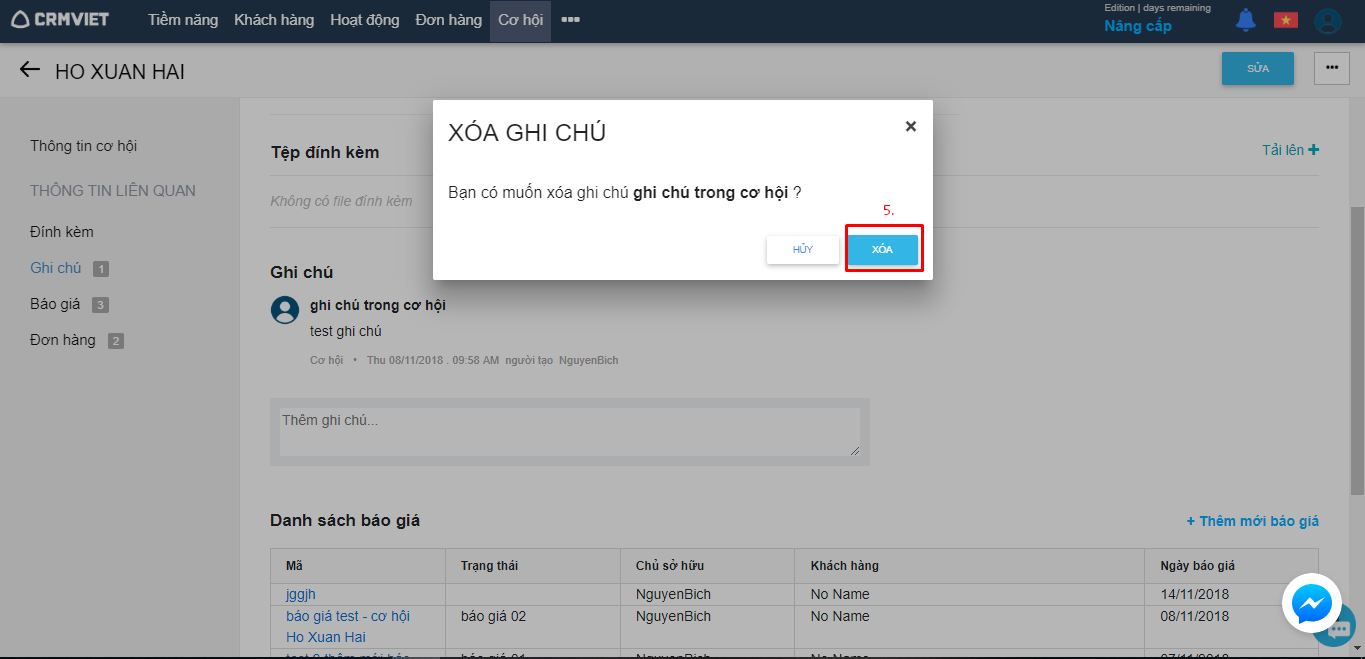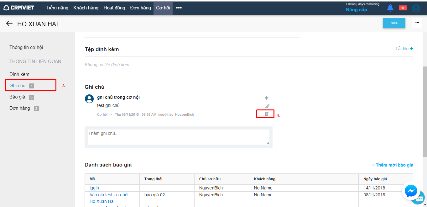 Bước 1: Tại module cơ hội -> Chọn cơ hội cần xóa ghi chú(Hình 1)