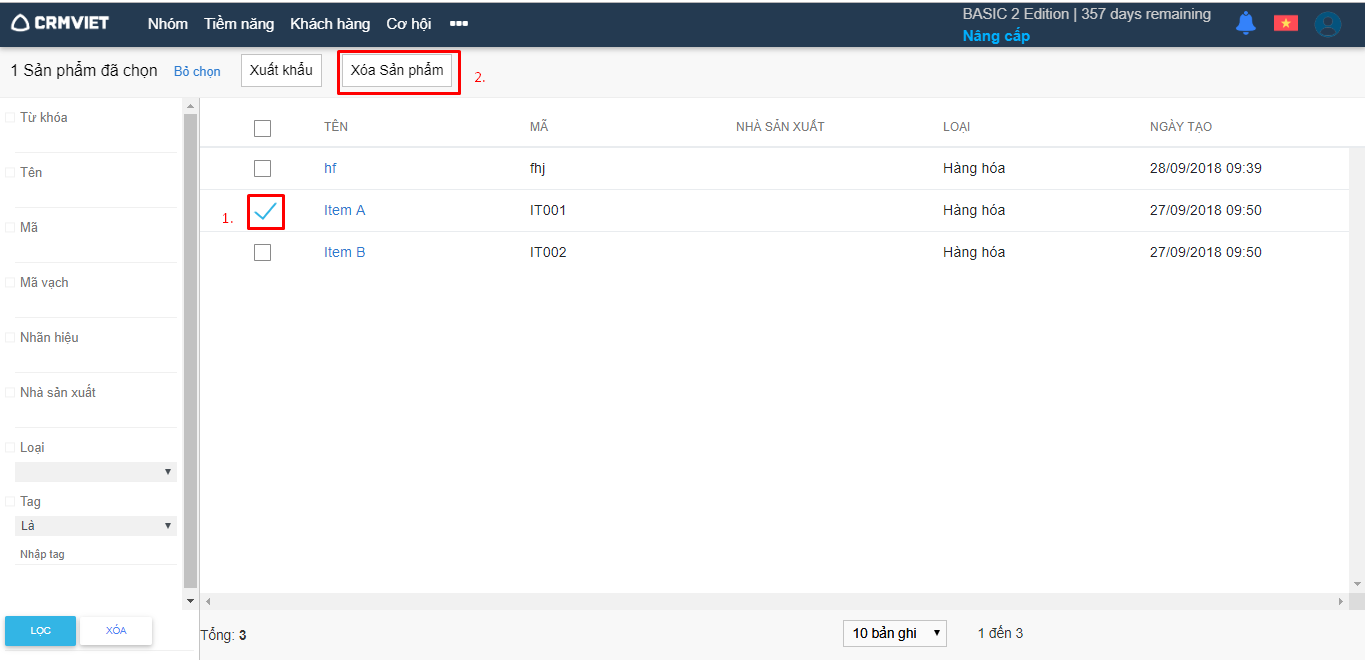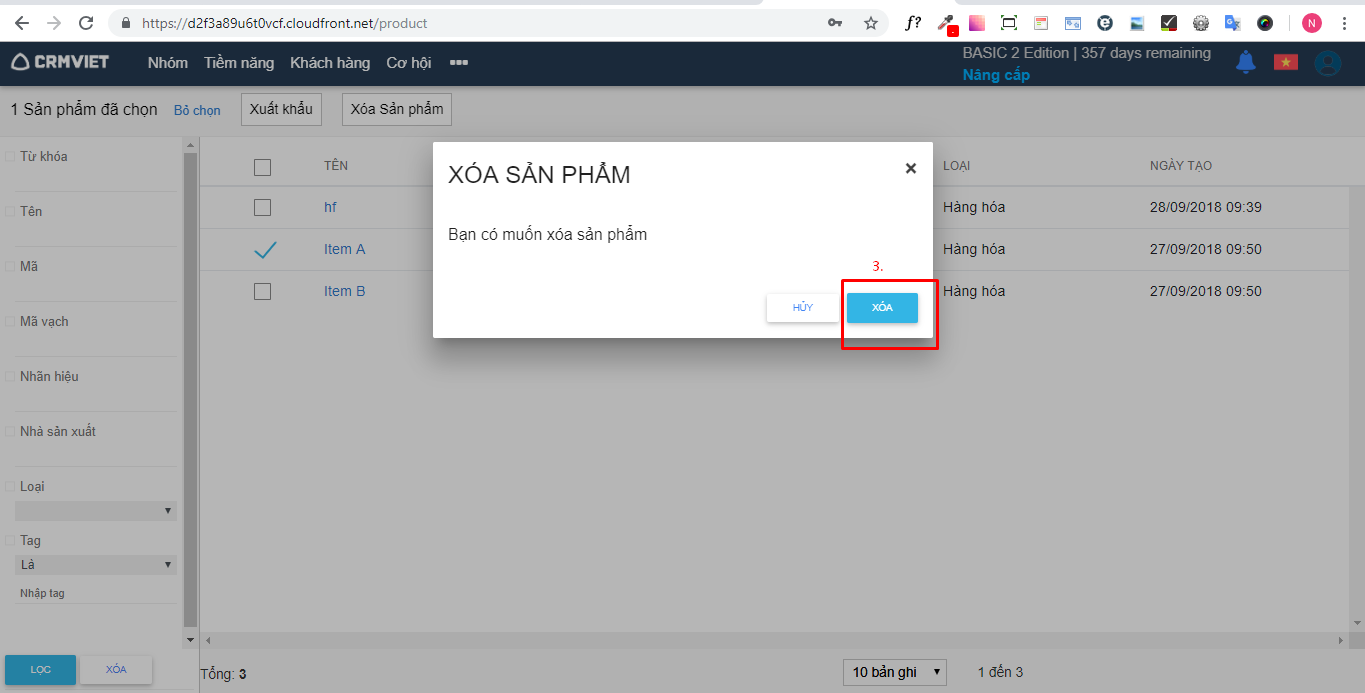 Thao tác để xóa sản phẩm: Danh sách sản phẩm -> Tích chọn sản phẩm cần xóa -> click chọn Xóa sản phẩm để xóa -> Xuất hiện pop up xác nhận xóa -> click chọn Xóa để xóa & click chọn Hủy để không xóa. (Hình 1,2)