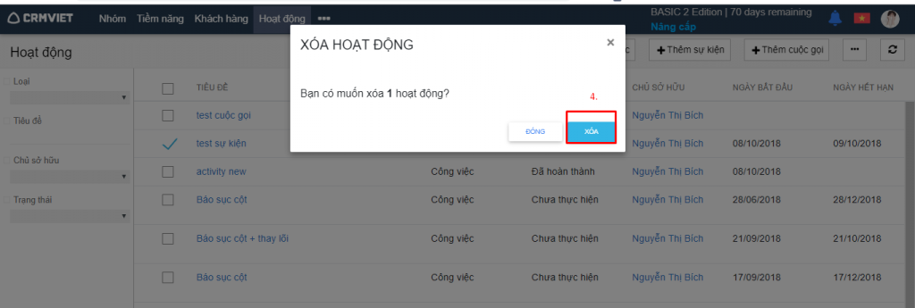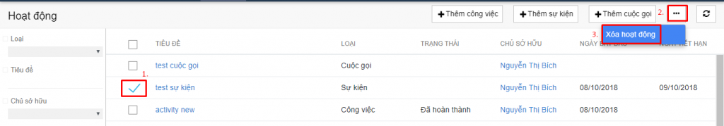Thao tác để xóa sản phẩm: Danh sách hoạt động-> Tích chọn sự kiện cần xóa -> click chọn nút More -> Click chọn Xóa hoạt động để xóa -> Xuất hiện pop up xác nhận xóa -> click chọn Xóa để xóa & click chọn Hủy để không xóa. (Hình 1,2)
